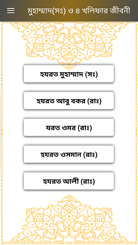 এই অ্যাপে খলিফা-প্রাপ্তির ক্রমানুসারে সবার জীবনী দেয়া হয়েছে ঠিক এভাবেঃ