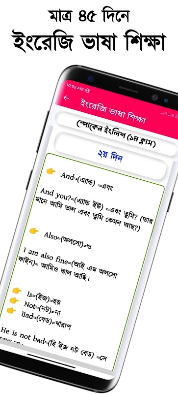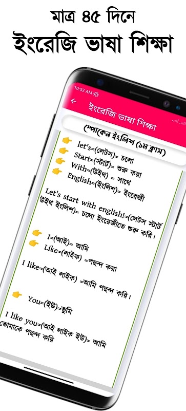 অর্থসহজঅনুবাদ、স্পোকেনইংলিশ、ইংরেজিতেকথাবল ার সেরা ফর্মুলা,英语词汇表,ইংরেজিতে কথোপকথন ইত্যাদি সন ্নিবেশিতকরাহয়েছে। ১৫ টি ক্লাস করে ৪৫ দিনে ইংরেজি শিক্ষা করে নিজেক েদক্ষকরেতুলুন।