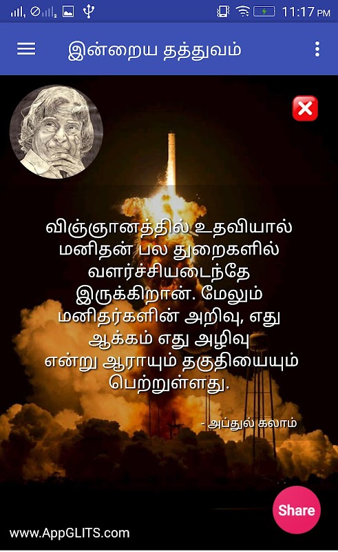 நீங்கள் எளிதாக உங்கள் நண்பர்களுக்கு வாட்ஸாப்ப் பேஸ் புக் ட்விட்டர் ஈமெயில் மூலமாக பகிரலாம். உங்கள் நண்பர்களும் அப்துல் கலாமின் தத்துவங்களை வாசிக்கட்டும்.