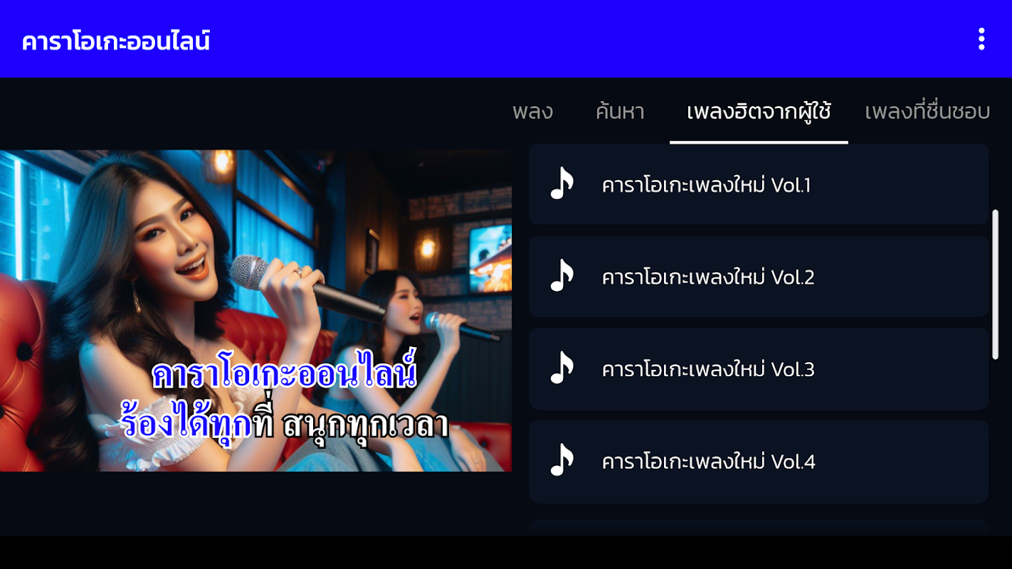 - 泰歌卡拉OK各种类型的音乐,如 Lukthung、Mo Lam、String、Suntaraporn、Dance、Hip-Hop for Life 和 International。