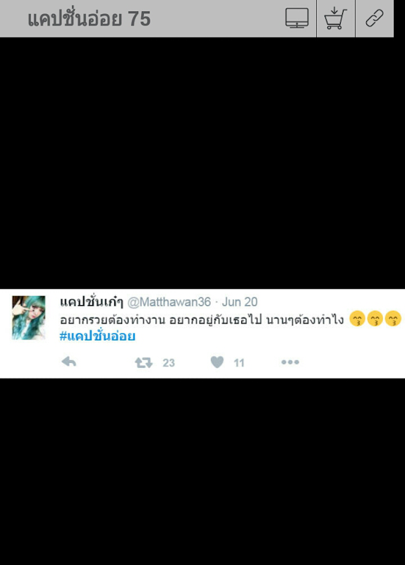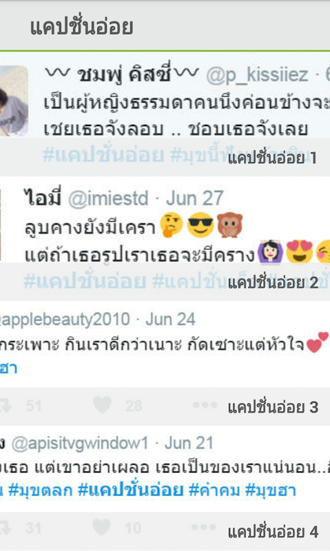 แอพพลิเคชั่นรวบรวมแคปชั่นอ่อย แคปชั่นเสี่ยว แคปชั่นโดนๆ ประโยคเด็ดๆ รวบรวมเอามาไว้ให้ทุกท่านได้นำไปโพสต์กันใน Facebook, Line, Twitter แคปชั่นอ่อยประโยคไหนที่โดนใจ ก็ลองเอาไปโพสต์กันดูนะ รับรองหัวเราะกระจาย กดไลค์กระจุย ไม่ว่าจะเป็นแคปชั่นอ่อย แคปชั่นฮาๆ แคปชั่นจีบสาว แคปชั่นความรัก แคปชั่นเสี่ยว แคปชั่้นกวนๆ แคปชั่นทะลึ่งๆ แคปชั่น IG รวมแคปชั่นอ่อยเด็ดๆ บาดจิตบาดใจแน่นอน แคปชั่นเหล่านี้ผ่านการคัดกรองมาอย่างดีจากทีมผู้พัฒนา อ่านแล้วโดน อ่านแล้วจี๊ดใจ อ่านแล้วขำกลิ้ง หลากหลายอารมณ์ สามารถเซ็ตเป็นวอลเปเปอร์, เซฟเก็บไว้ในเครื่อง หรือแชร์ให้เพื่อนๆ ดูได้ โดยจะมีการอัพเดตแคปชั่นอ่อยฮาๆ แคปชั่นโดนใจเพิ่มขึ้นเรื่อยๆ