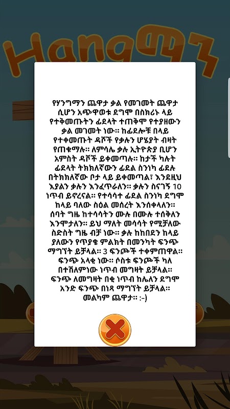 这是一款用阿姆哈拉语制作的绞刑架游戏。游戏要求玩家猜出一个单词,而你需要做的就是找出猜中的单词。游戏提供了 26 个字母,其中一些字母可以组成猜中的单词。空心虚线会提示你这个单词包含多少个字母。如果你选对了字母,这个字母就会被放到正确的位置,这样你就会更接近答案。如果你选错了字母,你就会被视为绞刑架上的囚犯,绞刑完成后你就会彻底死掉,游戏结束。
