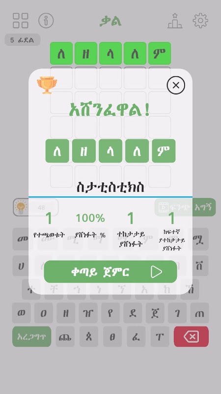 埃塞俄比亚阿姆哈拉语 (አማረኛ) Wordle 游戏语言,包含 3 个字母、4 个字母和 5 个字母。游戏玩法无限制,遇到难题时可以使用提示来猜单词。