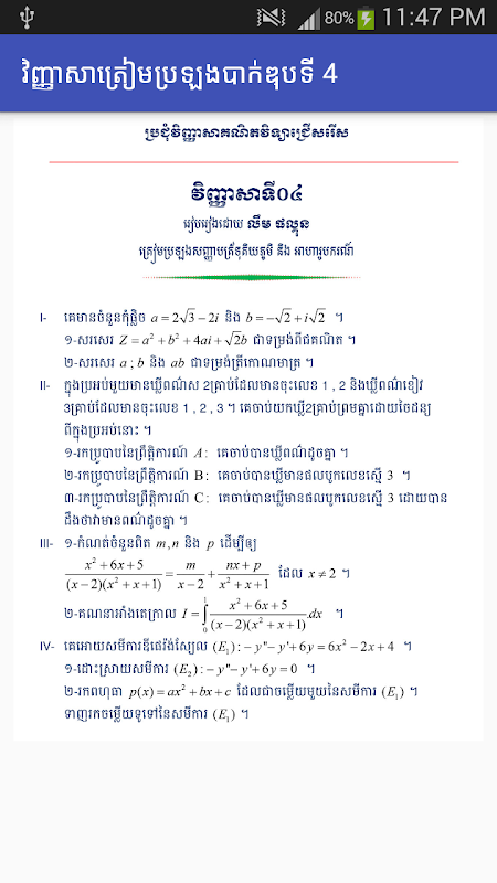 កម្មវិធីនេះត្រូវបានដកស្រង់ចេញពីសៀវភៅ វិញ្ញាសាត្រៀមប្រឡងសញ្ញាបត្រមធ្យមសិក្សាទុតិយភូមិ របស់លោកលោកគ្រូលឹម ផល្គុន ហើយត្រូវបានរៀបចំជាផ្នែកៗ ងាយស្រួលដល់អ្នកដែលប្រើប្រាស់ស្មាតហ្វូន។ នៅក្នុងកម្មវិធីមានទាំងវិញ្ញាសាត្រៀមប្រឡង និងចម្លើយ ទាំងអស់មាន ១៥ វិញ្ញាសា។