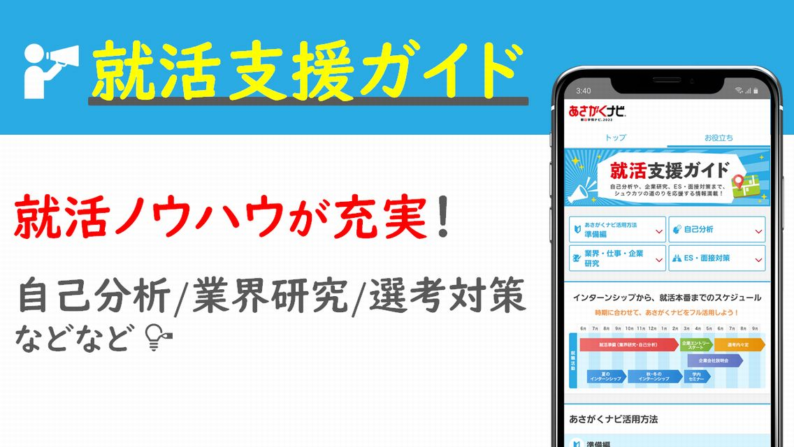 新卒向け就活・就職情報サイト「あさがくナビ2022」の公式アプリです。