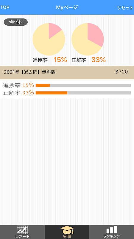 「レポート」であなたの学習時間を確認できます。「成績」で全体およびカテゴリごとの問題の進捗率、正答率を確認できます。 「ランキング」で学習時間、成績を元にしたポイント・ランキングを確認できます。ランキングは、ランクと今週の2種類があります。