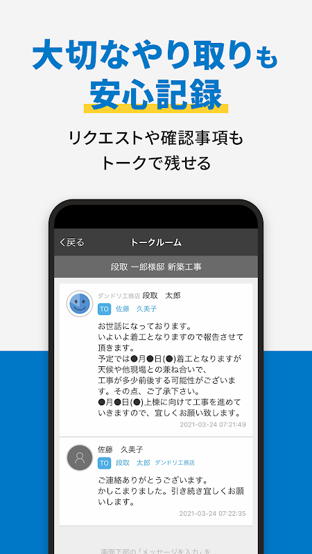 您可以从报告谈话室顺利查看施工工作详情和进度。通过将确认项目的交换整合到一种工具中,我们消除了信息遗漏和理解差异。