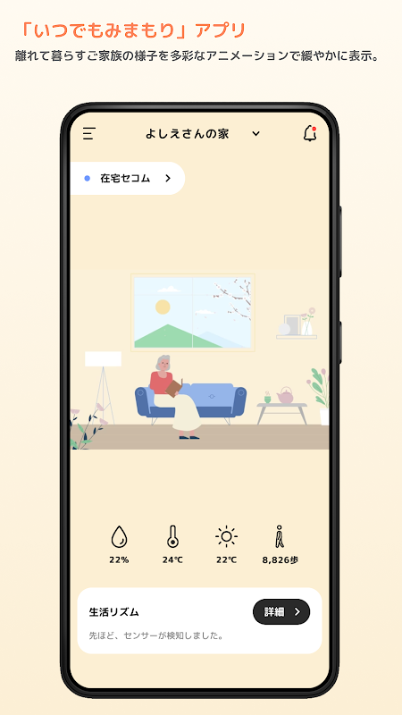 随时随地与重要家庭联系的“随时Mimamori应用程序”。根据传感器检测到的数据,我们将通过动画轻松传达家庭状态。
