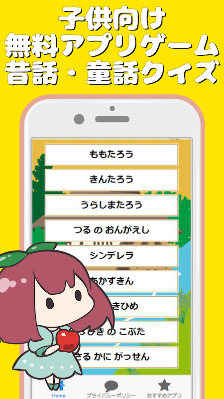 昔話や童話、グリム童話の問題が出題される無料のクイズアプリです。。