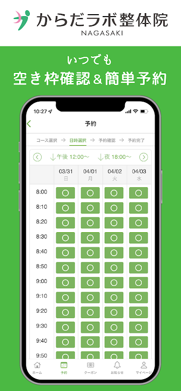 通过该应用程序,您可以收到[Karada Labo Chiropractic Clinic NAGASAKI]的超值优惠。您还可以随时通过智能手机查看菜单、所需时段并进行预订。通过安装该应用程序,您可以更方便、更轻松地使用[Karada Labo Chiropractic Clinic NAGASAKI]。