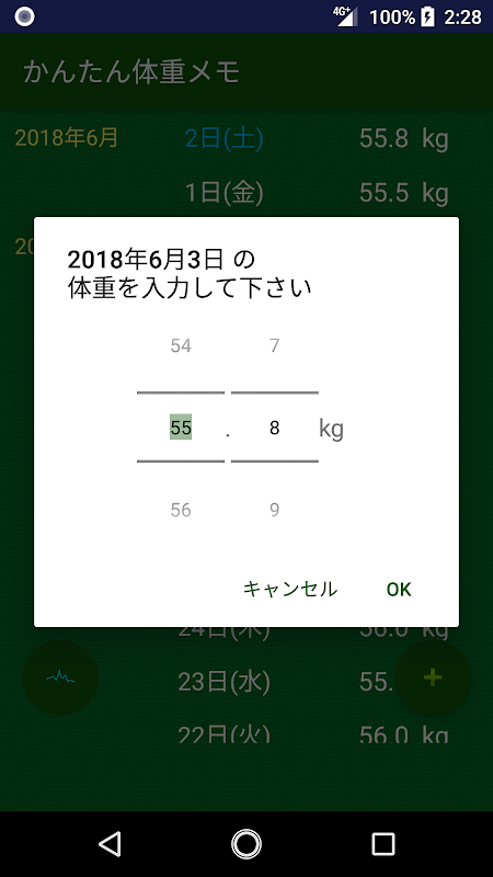入力を忘れても過去の日付の体重もさかのぼって入力、編集、削除ができます。