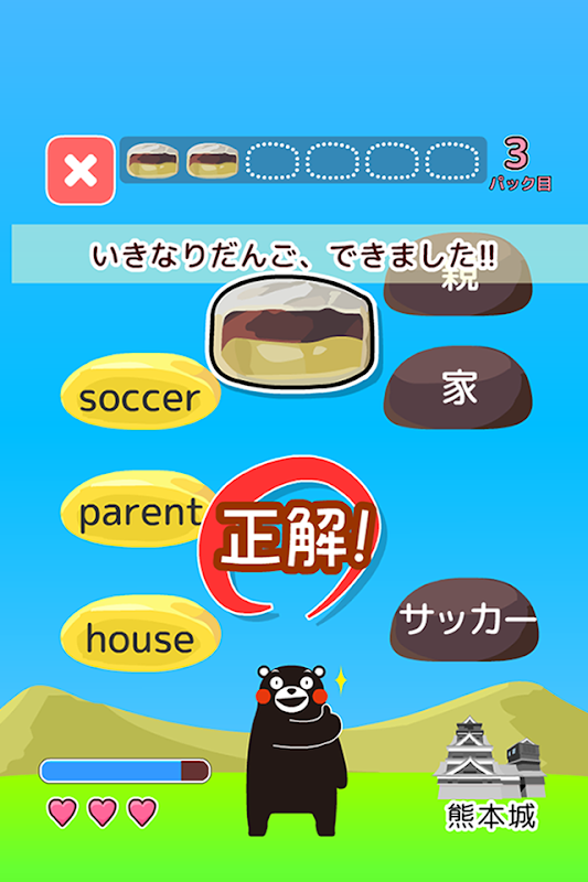 这是一个学习的应用程序记住kumamon和英语单词! 在含义的英文单词很好地结合起来,这会让很多熊本县特产的“突然饺子”!