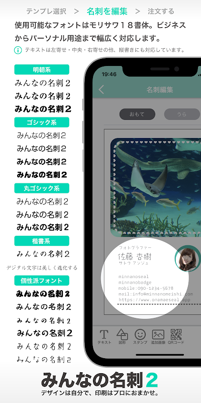 从100多种模板中选择适合您的名片,然后使用文本,图像和图章创建您自己的名片。 (您可以免费创建任意数量的名片数据。)您可以在应用内订购名片设计,并在最短的一天到达*。 (*到达日期因目的地而异。)
