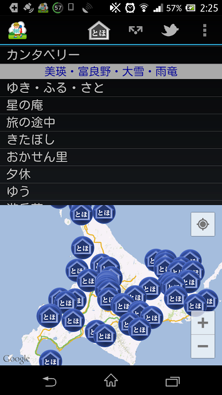 アクションバーの とほ ボタンを押すと、地図上に表示されます。