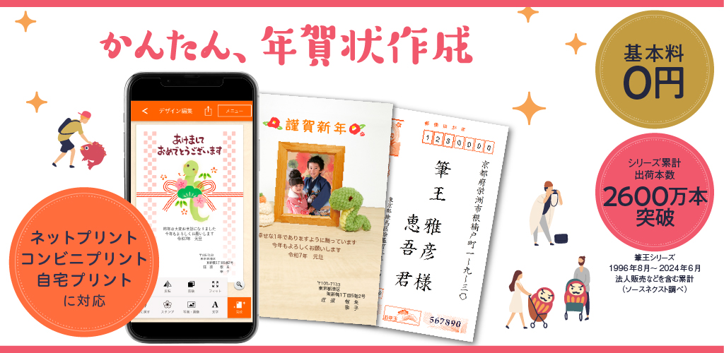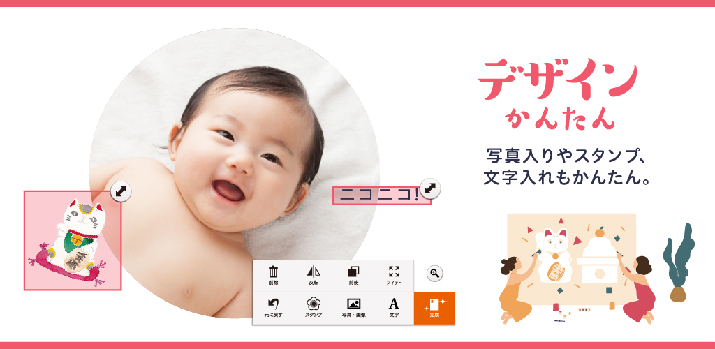 通过直观的操作,您可以添加照片、图章和文字,制作原创贺年片。