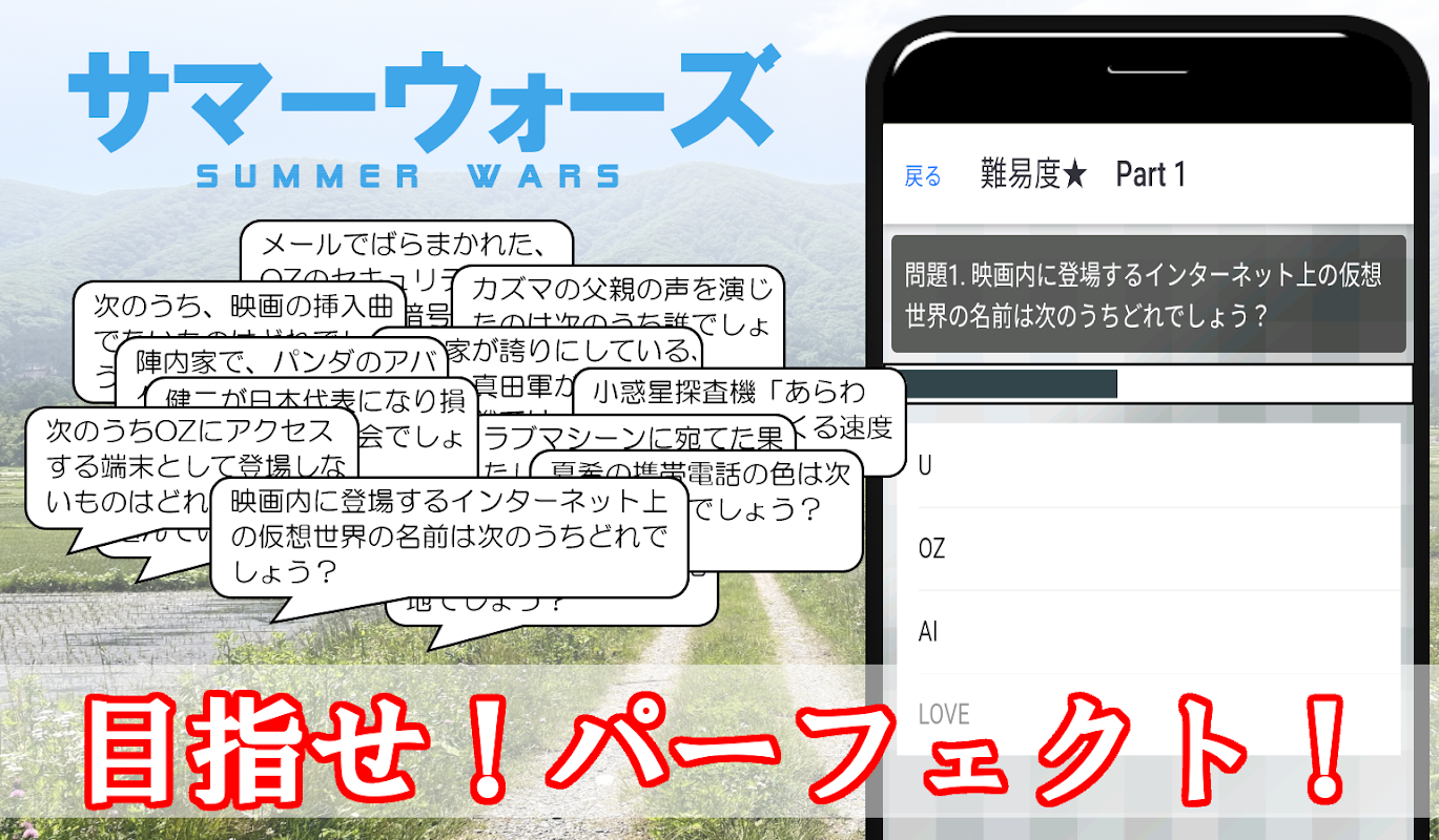 このアプリでは、映画『サマーウォーズ』のストーリー、キャラクターや各種エピソード、音楽や公開情報など、あらゆる問題が、難易度別に出題されます。