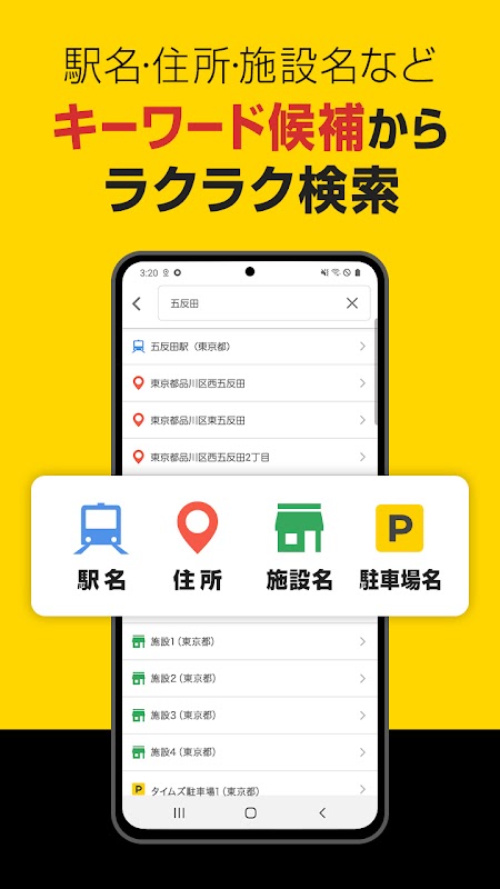 您可以根据您当前的位置、车站名称、设施名称、地址和停车场名称搜索时代停车场的信息。