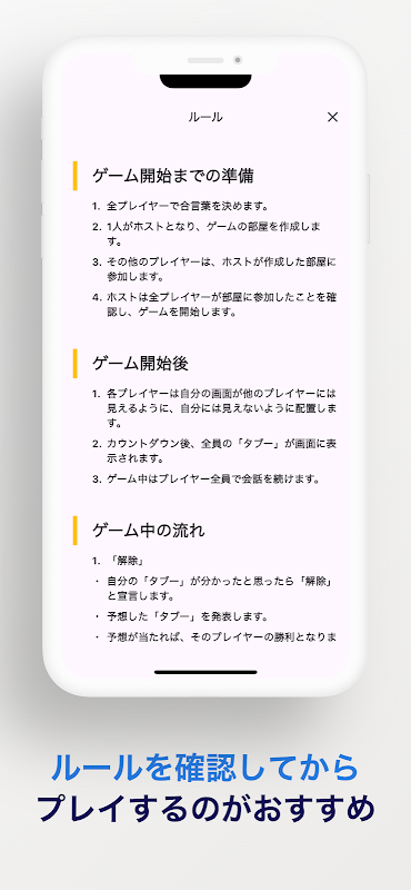 プ re イヤー一人一人に「タブー」を与えて、その「タブー」を破った人はゲームから扶手する。