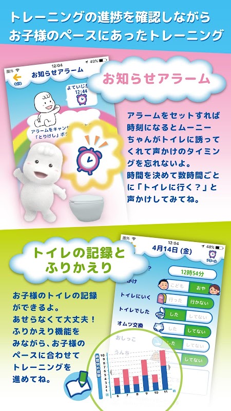 此外,您可以记录厕所并具有厕所定时通知功能,因此您可以检查孩子的进度并按照自己的步调继续训练。