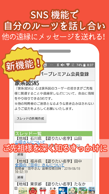 ・通过“远亲查找”功能,您可以从用户的公开信息中查找和了解远亲、祖先。您可以使用智能手机轻松搜索远方亲戚,这是电视节目中的热门话题。
