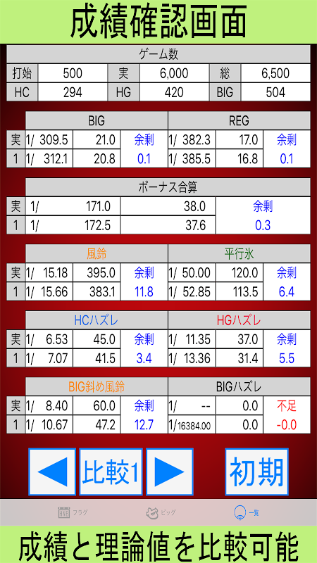 「比較ボタン」で実践値とどの設定の理論値と比較するか変更できます。