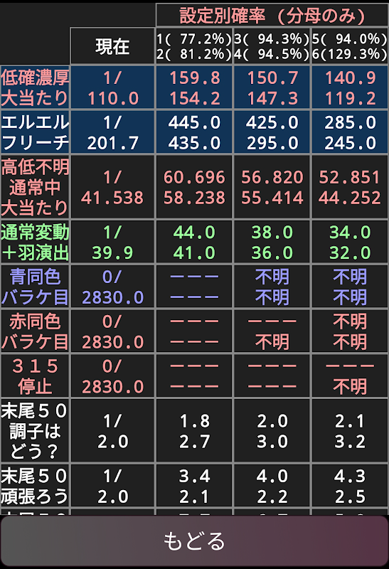 ⑧現在の出現率と各設定の出現率を一覧表示可能
