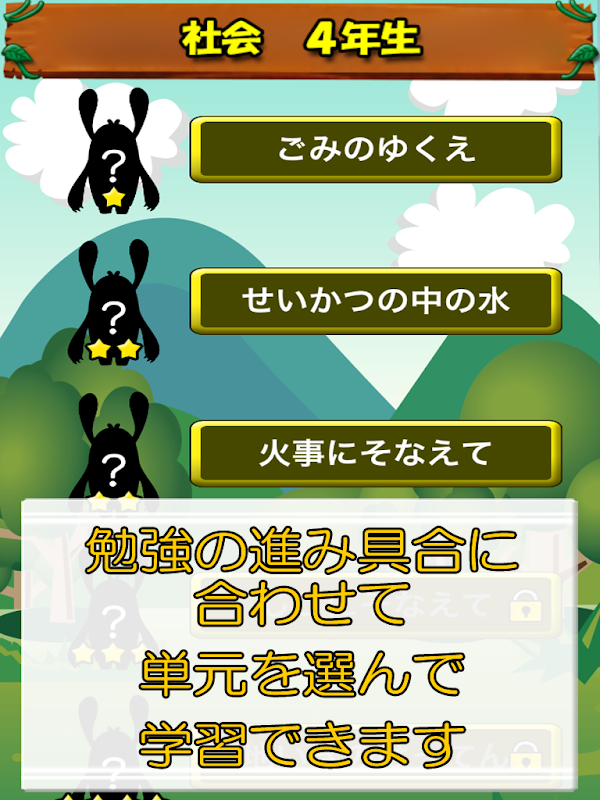 小学4年级的社会应用程序最终版!选择单元以匹配的学习进度,可以有效地检查。 4易于使用的选择题测验形式,在一个有趣的去收集怪物奖励学习,孩子会不断研究。