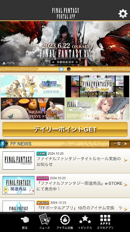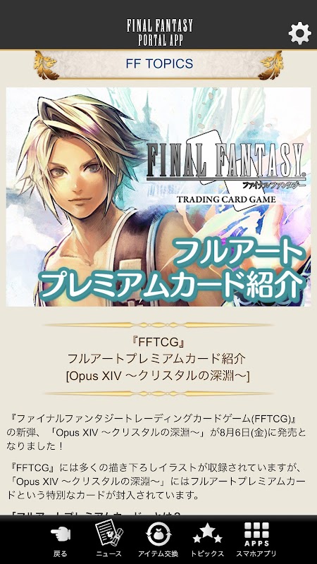 是“最终幻想”的综合信息应用。 如游戏,出版和音乐制品的事件,并提供所有的最终幻想相关的最新信息。