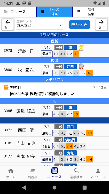 ・選手リストを作って今日のレース結果とニュースを一覧表示できます