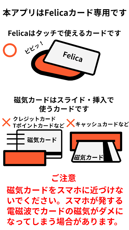 ※磁気カードが使えなくなる恐れがありますので、磁気カードを読み取ろうとしないでください。スマホの取扱説明書に書いてありますとおり、スマホ本体が発する電磁波により磁気カードに悪影響を与えます。なお、基本的に磁気カードは、読み取り機にスライドさせる、もしくは挿入するタイプのものです。本アプリが対応するのは、読み取り機にタッチするタイプ(Felica)です。