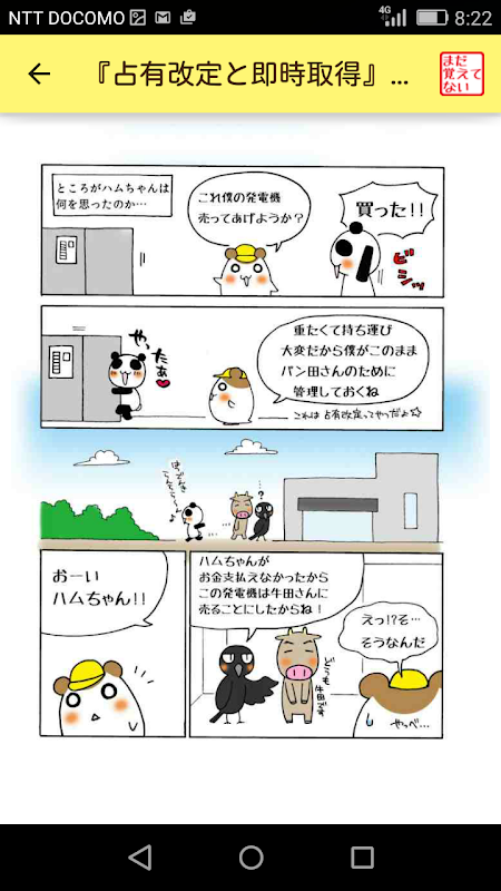 このアプリはよくある「マンガでわかる○○」とあるのに、実際にはマンガはオマケ程度でほとんど文章解説ばかりという本とは違い、民法判例の事実関係から、結論まで全てマンガにして分かりやすく解説します。マンガの他に簡単な文章解説も用意しているので、更に理解が深まります。