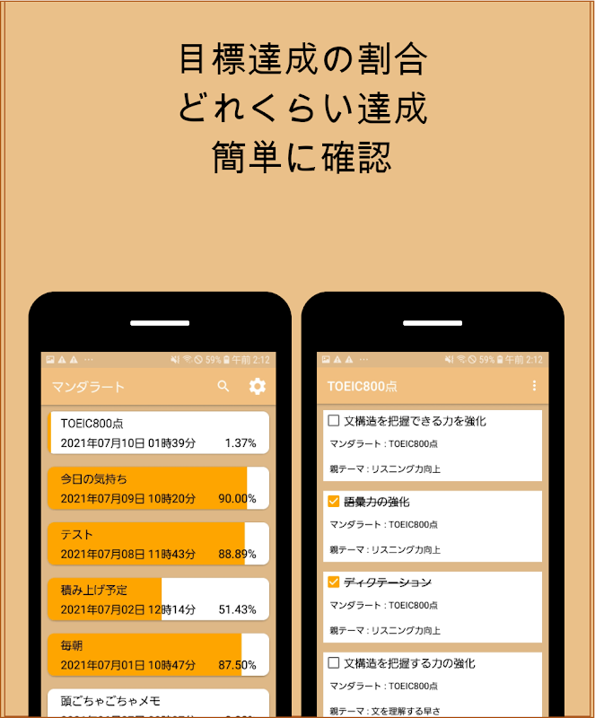 ・目標一覧を表示できるように(マンダラート画面(テーマ詳細画面も)のメニューにあります。