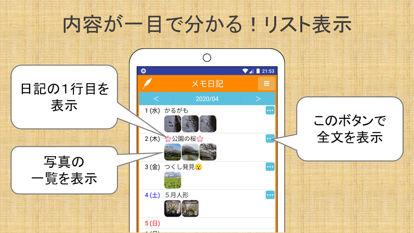 关于メモ日記(カレンダーに写真を添付できるシンプルな日記帳)