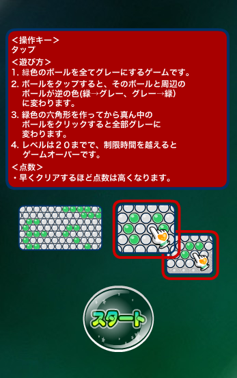 2. ボールをタップすると、そのボールと周辺のボールが逆の色(緑→グレー、グレー→緑)に変わります。