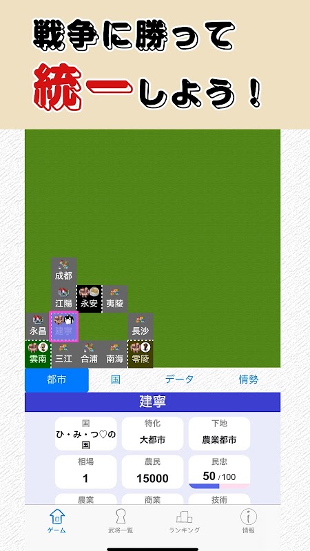 毎日コマンドを入力して、内政や戦争をして統一を目指そう!