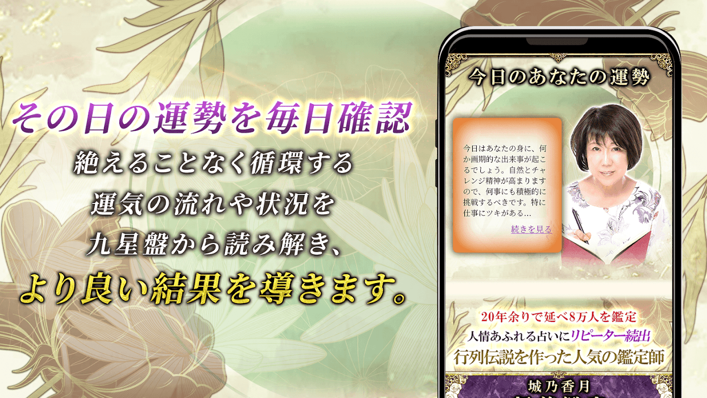 《九星气学》是中国古代流传下来的连接人与天命的秘术。城野一树拥有超过20年的鉴定经验,通过回应许多担忧而改变了人们的命运,他将预测你与那个人的关系、兼容性和命运的一切。我们将通过从您的出生日期计算出的精确评估方法,帮助您在爱情、婚姻和生活中取得成功。