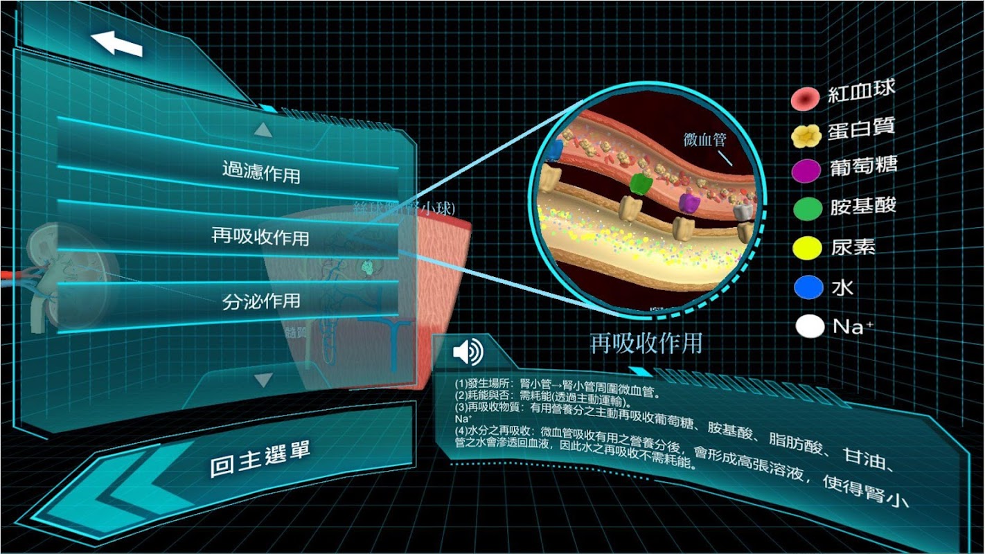 以虛擬實境(VR)教材呈現泌尿系統位置、腎臟構造、腎元各部位構造、尿液形成歷程,並出題、設計評量,讓學生以點選方式選取正確選項。