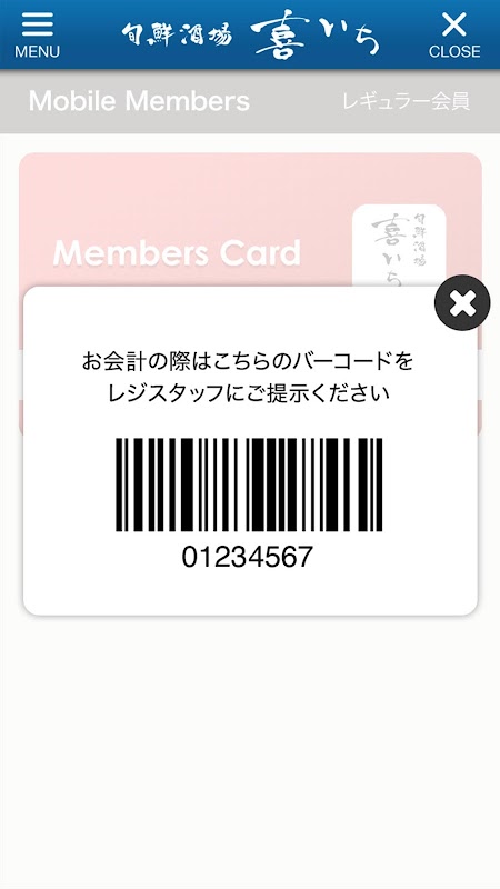 「会員番号バーコード」の表示機能は、店頭でのお買い上げ時に提示することで、スムーズな会計が可能です。
