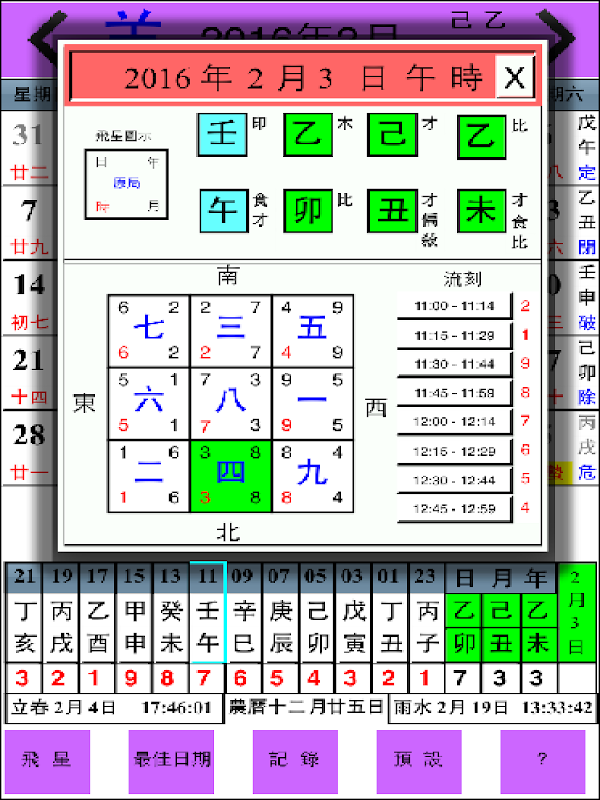 风水飞星万年历。可基于不同方位之流年,流月,流日,流时,流刻之资料,而选取合适之日期,时间及方位以利协助有关之事项。