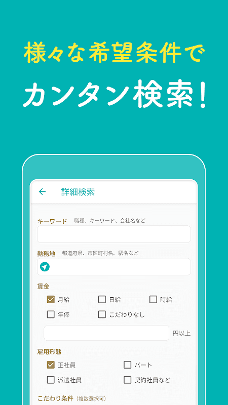 除了正式员工和合同员工之外,您还可以根据您想要的条件进行详细搜索,例如打工,派遣和打工等各种就业形式,希望的时区和星期几。