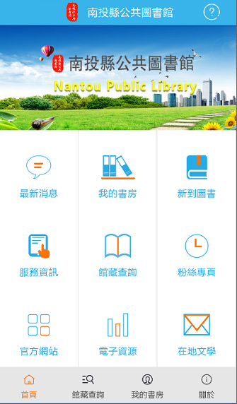 內容包括南投縣公共圖書館館藏查詢,讀者個人化服務,分館服務資訊及其他公共資訊連結。