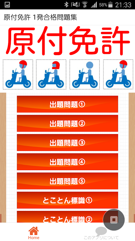 このアプリは、全国の運転免許試験場で出題されている原付免許試験問題をあつめた無料学習アプリです。特に交通ルールの基本、道路標識は普通免許でも出てくるような問題も加えてました。