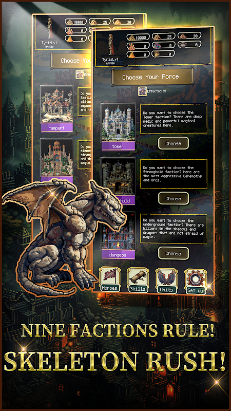 从《魔法门》宇宙中招募英雄,每个英雄都拥有独特的特殊能力、武器和宝藏。收集、训练和升级数十种令人生畏的部队和生物,包括骑士、皇家狮鹫、大天使、巨龙、兽人等等。