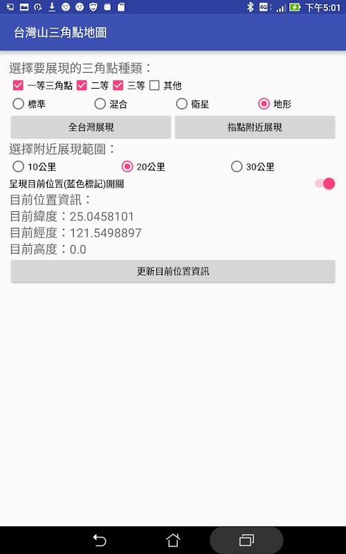 可選擇及呈現台灣大小山,包括一等二等三等及其他三角點共4千多筆資訊標誌於地圖上,並用不同顏色區別,點觸標誌可顯示山名及山高。一等:紅色,二等:紫色,三等:綠色,其他:黃色 (不支援Android 5以下)