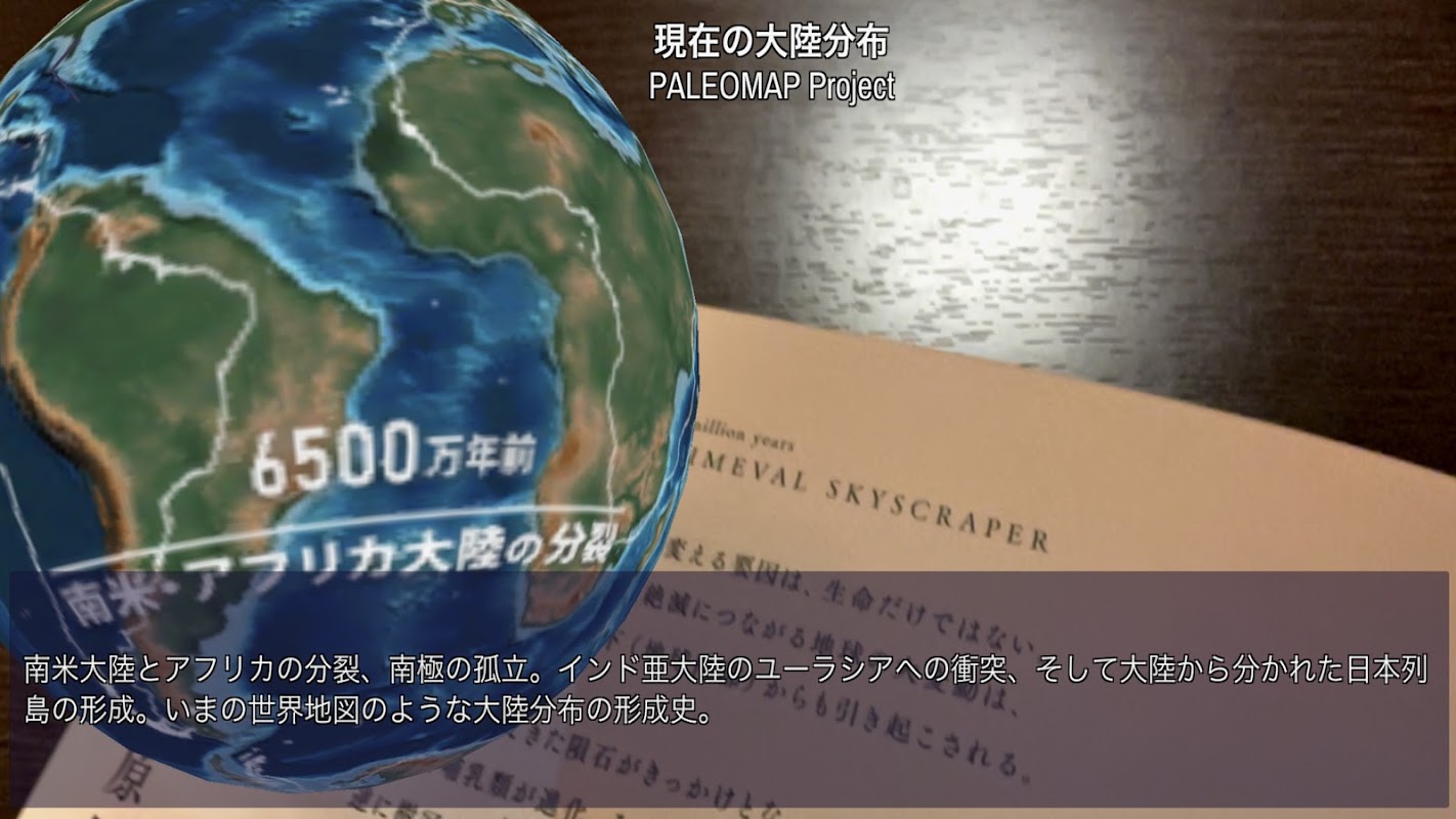 そこで各年代に特徴的なイベントをAR機能で動的に表現しました。たとえば5億年や5000万年のスケールでの大陸移動の様子(超大陸パンゲアの形成と分裂、南極大陸の孤立と地球の寒冷化など)、5万年や5000年スケールでの人類の移動、あるいは氷河時代の激しい気候変動のグラフを、誌面からポップアップするARの3D地球儀やグラフアニメーションで表示するシステムを開発しました。
