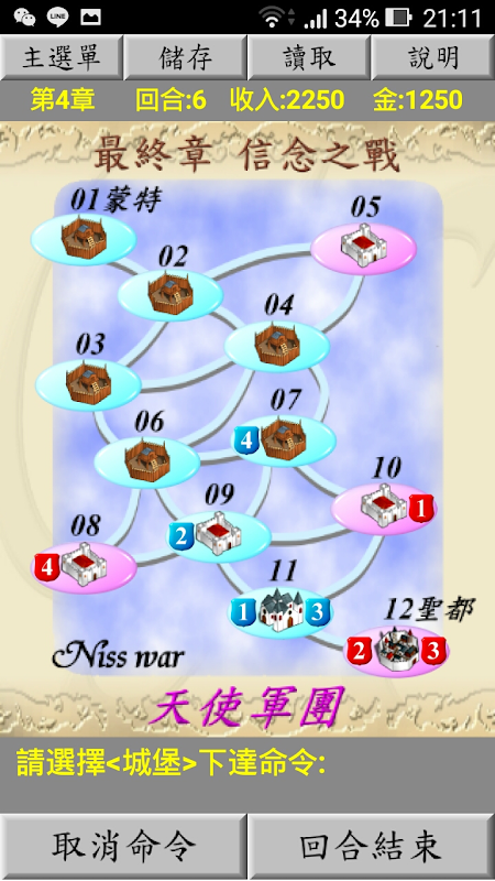 本游戏共有4关,每过关后会得到评价,使用越少回合,占领城堡越多,评价越高.