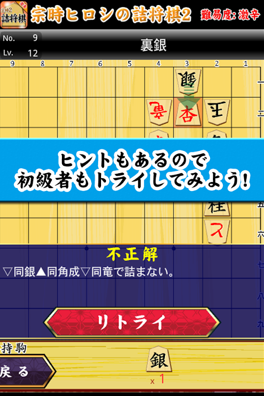 「詰将棋を解く」をタッチすると作品が表示されます。 攻方の駒をタッチすると選択状態になりますので、移動させたい箇所の盤上をやはりタッチします。 正解手ならば玉方が自動的に対応してくれます。不正解ならばその場で初手からやり直しになります。