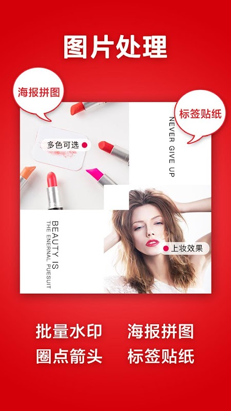 一次可以批量作图100张,包括批量水印、免费在线水印模板、上传自己的logo、定制个性水印、修改水印颜色字体、修改透明度、添加文字、批量剪裁、贴纸、标签、画笔、圈框、二维码制作、批量滤镜、马赛克、箭头等一站式图片处理能力!更有拼图海报功能,帮你美化宣传图片!还可以写文章,插入图文、语音、视频,文章还可以生成长图片!新增微社区模块,方便微商自由交流~