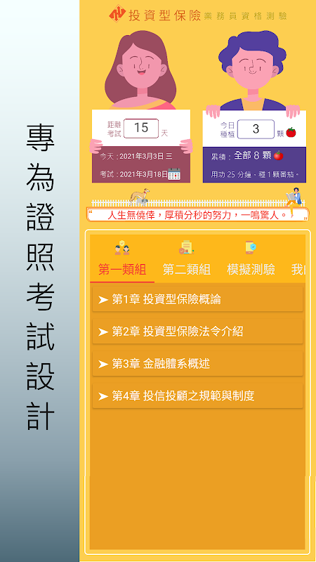 本團隊以考生的角度出發,和業內人士的建議,再經多次實測後上架的金融證照專用的APP,功能包括:考試天數倒數、番茄鐘計時提醒、模擬考場考試練習、自訂標記題目等等..