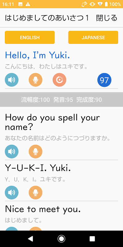 ●“ Kaiwa”还为您提供三点:“流利”,“发音”和“完整性”。